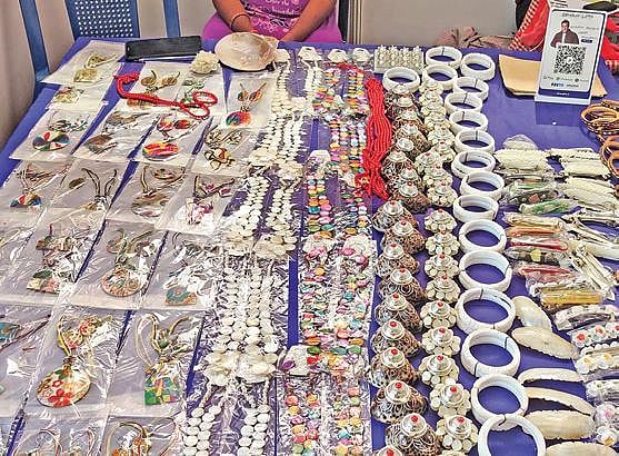 Women and girls are making a beeline to the oyster jewellery stall at the Crafts Bazaar. The jewellery is not only attractive, but also sits lightly on one’s pocket. This Malayali couple has been making jewellery and accessories for the past 12 years. “My wife makes almost all the items that we sell. Oyster shells are of no use after the pearls are extracted. But we utilise the shells. I believe we can make something out of everything that nature gives us,” Binu said.