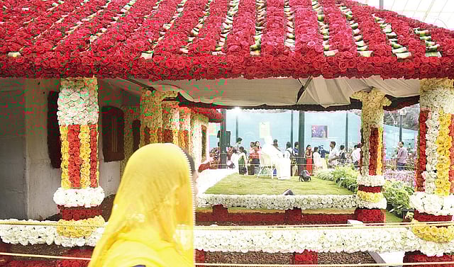 On Friday, governor Vajubhai Vala inaugurated the show which will continue till August 15 at Lalbagh. The Kavimane housed at Glasshouse has been made out of 3.5 lakh Dutch roses, carnation flowers and orchids. The Horticulture department authorities will replace flowers once in three days to keep the fresh look intact. Total 10.5 lakh flowers are likely to be used on the structure, height of which is 21 feet. The width is 38 feet.
