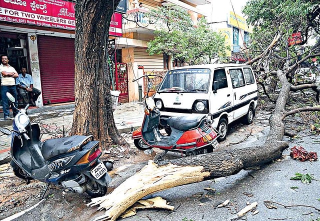 BENGALURU: Tuesday's thundershowers across north and west Bengaluru, besides some areas on the south-eastern city outskirts, resulted in chaos. Around 61 trees were uprooted, live wires snapped and 36 electricity poles broke down across the city. In two of the major tree fall cases, one massive tree came down on a house in Malleswaram which partially damaged the house, while in Mahalakshmi Layout, another tree fell on two cars and a bike, damaging all three vehicles. However, there were no reports of casualties in any of the cases.