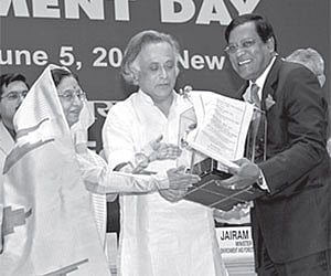 Sarthak Behuria, Chairman, IndianOil, recieved a silver lotus trophy, citation along with a cash prize at a function held at Vigyan Bhawan, New Delhi on Sunday. B N Bankapur, Director (Refineries) and A Saran, ED, BRPL accompanied Behuria.