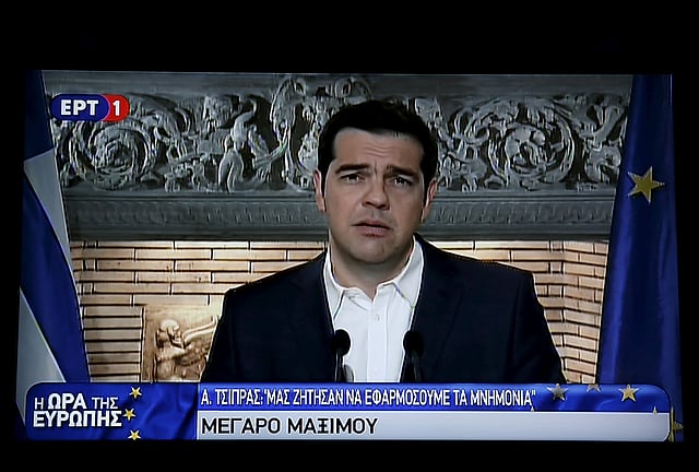Greek Prime Minister Alexis Tsipras is seen on a television monitor whille addressing the nation early June 27, 2015.| Reuters