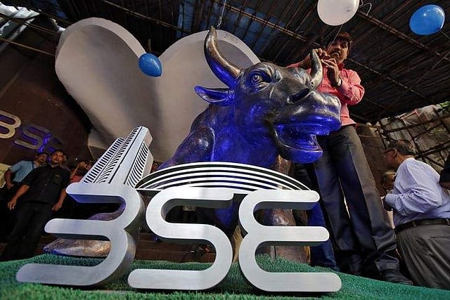 A man ties a balloon to the horns of a bull statue at the entrance of the Bombay Stock Exchange on April 26 while celebrating the Sensex index rising to over 30,000. (File Photo | Reuters)