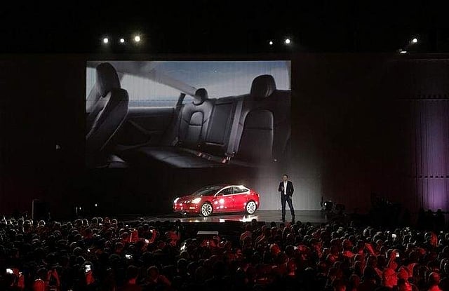 Outside Tesla's Fremont, California factory, Musk showed off the $35,000 base vehicle with a range of 220 miles (350 km) on a charge that marks a departure from the company's earlier luxury electric cars.