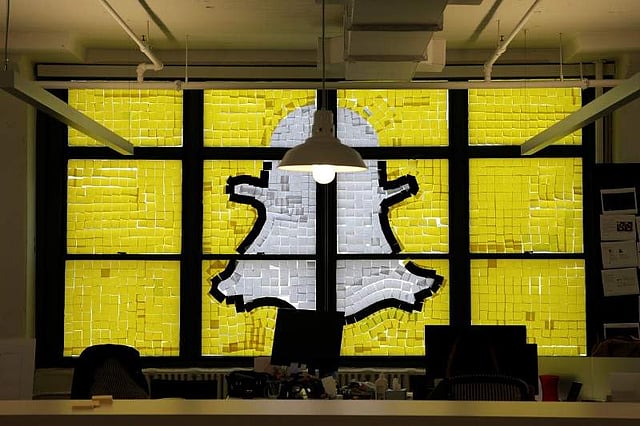 An image of the Snapchat logo created with Post-it notes is seen in the windows of Havas Worldwide at 200 Hudson Street in lower Manhattan, New York, U.S. | Reuters