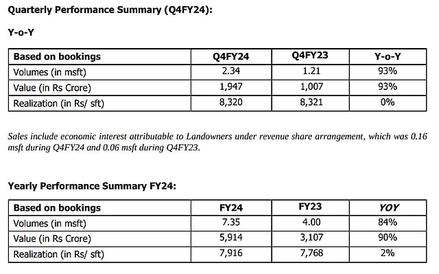 The actual revenue will be shown as 'collections'. On this aspect, the company reported its highest-ever collections from the real estate business during FY24, at Rs 3,609 crores vs Rs 2,258 crores in the previous year, an increase of 60%.