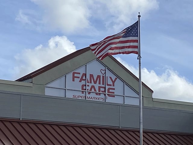 The Family Fare store is in a retail strip with a triangle-shaped sign at the top of the building. The sign structure, probably 5 feet (1.5 meter) wide and 8 feet (2.4 meters) high, has a door and is accessible from the roof, Warren said.