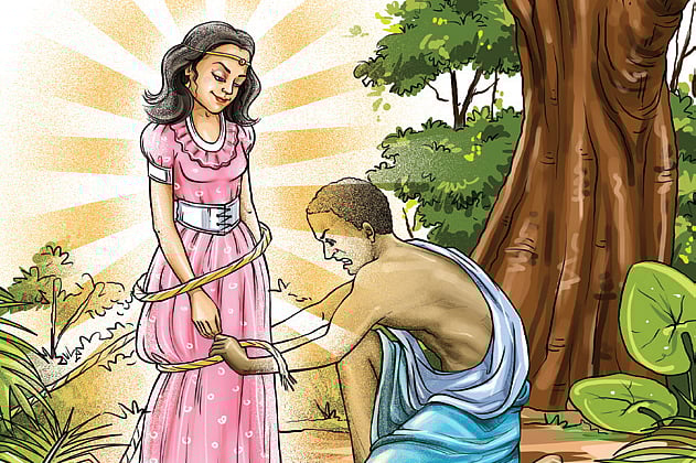 As he approached closer, he found a beautiful woman, radiant and shining like the sun, hanging from the raffia noose of the trap! Was she the Sun princess, wondered Lonkundo. “I’m so sorry, beautiful one! Here, let me get you out,” he apologised and gently released her.
