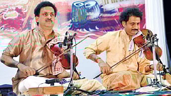 With an in-form duo, the spectrum of sound and tonal-textures became expanded and enriched further. The duo injected energy and passion into the alapanas, neraval and swaraprastaras. They shone forth in making their performance a unique event full of the creative mystery and excitement of the present moment. There were many creations which could be patented to them. A brief alapana in Nasikabhooshini followed by the familiar Maaravairy Ramani krithi was full of impact. Daasana maadiko enna(Nadanamakriya), Pibare Rama rasam (Ahirbhairav) and Mohanak alyani tillana formed the concluding part of Nagaraj and Manjunath’s resonating violin duet. On one or two occasions, the double mridanga support lent by H.S.Sudheendra and Jayacha ndrarao and the concert as a whole tended to be boisterous, but thank the artistes, they made amends suitably and music could be heard and enjoyed to the core.