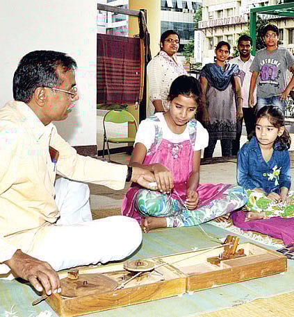City Express came across a man sitting on a raised platform spinning his charakha as people walked by curiously looking at him. He seemed to be at peace spinning khadi even though there was so much hullabaloo around.