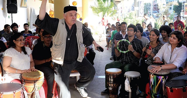 Though a monthly affair, the presence of Arthur Hull, the American percussionist, who is the pioneer of community drumming made the jamming more special. Sometimes conducting the drummers with dance-like movements and at other times leading with his cowbell, he even got them to take a break and stretch their fingers. “Raise your hands. Touch the elbow with the back of the tips of your fingers,” he said, setting off peals of laughter as the drummers attempted it.