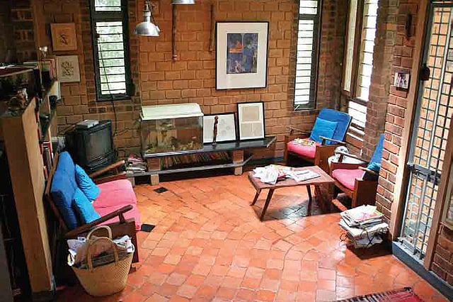 Vishwanath says, “We built our house in 1995 and the impulse was to maximise the bio-diversity on site, use all natural resources available and essentially put our money where our mouth was. It was also an opportunity to experiment as much as as possible with design ideas and materials.The area is around 1,600 square feet and the primary material used is earth excavated from the site itself. The colour palette is earth and orange. It took us six months to finish it.”