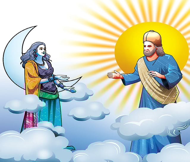 Finally the night fell and the moon came out. Along with her came her ten thousand children, the stars, who twinkled and twinkled. Father sun saw them too and
