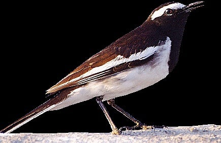 Distinguishing/identifying features : The Large-pied Wagtail, also called the White-browed Wagtail, is slightly bigger than the House Sparrow and is the largest member of the Wagtail family. As its name suggests, it keeps wagging its tail restlessly. The word Pied in its name denotes that it predominantly has the black and white colouration. It has black on the top and white below, and has a prominent white “eye-brow”, a white shoulder stripe and outer tail feathers.