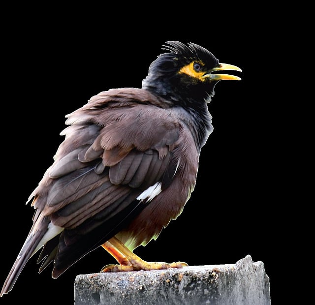 They are quite noisy, especially when in a flock. Their are chattier when they assemble in the evening hours at a common roosting place. The Common Mynas are known to make a wide variety of calls, from croaks and squeaks to whistling and chirping. They keep bobbing their heads as they walk among the grasses and calls out a quick “tweeek” as they suddenly take off. Common Mynas are even kept as pets in cages because of their ability to produce a wide varieties of calls. Our myths refer to them as “Kalahapriya”, meaning ‘One who is fond of getting into arguments’! It is indicative of the nature of its calls.
