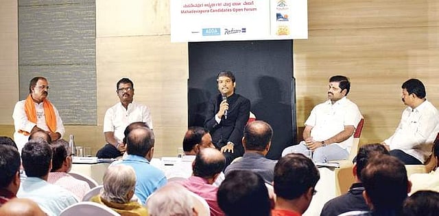Organised by Million Voter Rising campaign, supported by Bellandur Forum, Belthur Rising, Nallurhalli Rising, Force GW and Bangalore Apartment Federation, it saw the incumbent BJP MLA Arvind Limbavali, Congress candidate AC Srinivas, Aam Aadmi Party (AAP) candidate Bhaskar Prasad, Swaraj India candidate Ramesh Chander and JD(S) candidate Sathish K discuss the most pressing issues plaguing Mahadevapura constituency.