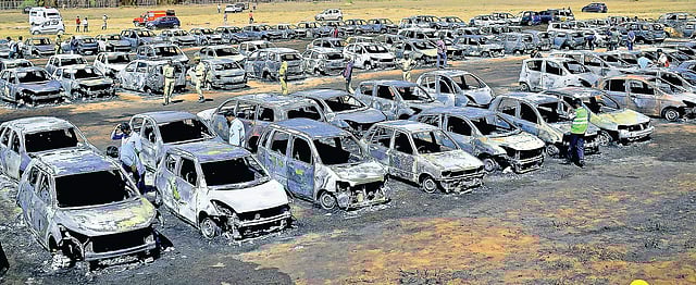 BENGALURU: The fire that gutted 318 cars at Aero India on Saturday, resulted in total chaos at the airbase, which was full of visitors who panicked on learning that their cars could have caught fire. As a huge plume of smoke rose and enveloped the airfield, the fear in the eyes of people was palpable.