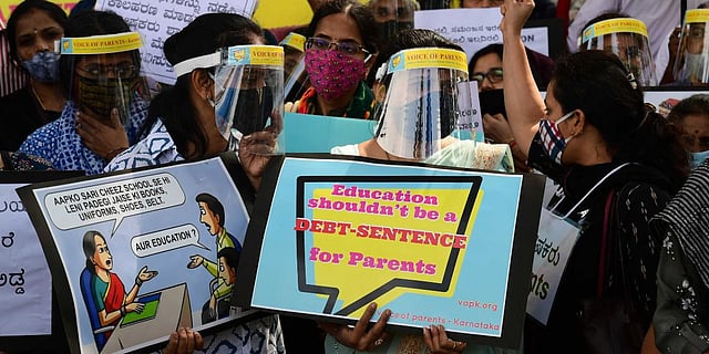 BENGALURU : More than 400 parents from across Bengaluru, with wards in CBSE, CISCE and SSLC schools, sat in protest at Mysore Bank Circle till Sunday noon, seeking redressal on the issue of fees. They urged the government against issuing any order to collect second term fees, and demanded a clear picture of the expenditure schools have incurred.