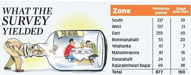 BENGALURU: The Bruhat Bangalore Mahanagara Palike (BBMP) told the Karnataka High Court on Monday that as per a BBMP survey conducted, 169 pubs, bars and restaurants in the city were operating illegally without authorisation, license or permission in eight zones.