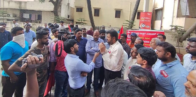 The protest, staged by the South Western Railway Mazdoor Union (SWRMU), began at 12.30 pm and concluded only after top railway officials and police rushed to the spot and pacified the agitating employees.
