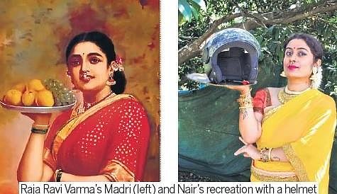 About choosing Raja Ravi Varma’s paintings, she says, “He has been a feminist and advocate of women’s rights. He tried to break gender stereotypes and his work has always been extraordinary.” She then recreated the paintings according to what she was going through. For example, she recreated Madri – lady with the fruit – using a helmet. “I have always been a bike rider.