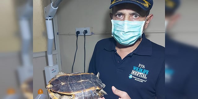 BENGALURU: A pond terrapin suffered multiple fractures on its shell after falling from the fourth floor of a building in Rajarajeshwari Nagar. It was picked up by a team of rescuers from People for Animals ( PfA) and was successfully treated.