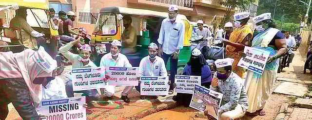 BENGALURU: Citizens from various parts of Bengaluru joined hands with the Aam Aadmi Party (AAP) on Wednesday to stage a protest with a difference -- Pothole Habba. They decorated potholes with rangoli and flowers, and offered puja to them. They also raised slogans against the government and BBMP for poor road conditions.