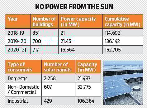 In all, 3,294 consumers have installed solar panels, of which only 70 are in government buildings. In 2020-21, 717 panels were installed of 16.564MW capacity, compared to 700 in 2019-20 of 21.45MW capacity. The cumulative green energy generation in Bescom limits up to March 31, 2021 was 152.705 MW, officials said.
