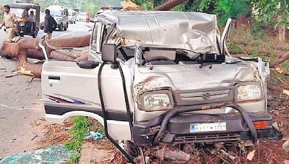 The mangled remains of a Maruti Omni, on which a tree branch fell on Monday morning, killing the driver and his toddler son, on the Bengaluru-Mysuru highway.