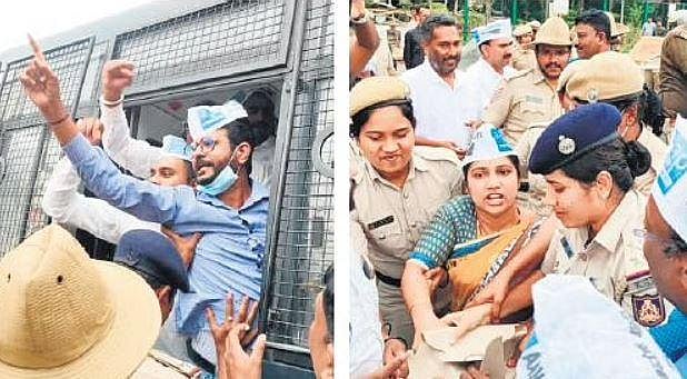 AAP members court arrest during their attempt to inaugurate the Shivananda Flyover in Bengaluru on Monday
