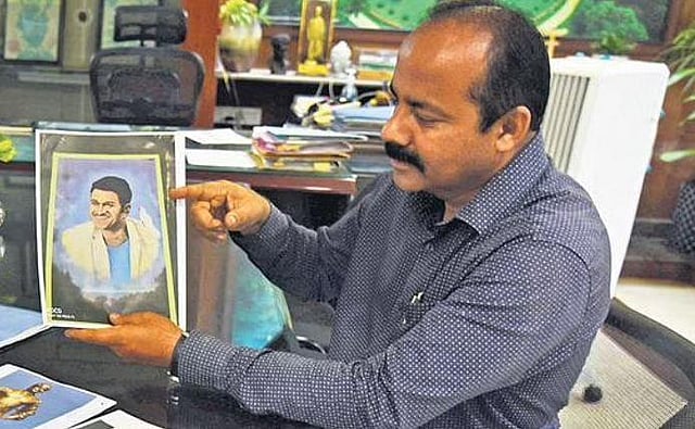 Lalbagh Joint Director M Jagadeesh shows samples of portrait and sketches to be put on display for the Flower Show between August 5 and August 15 | Vinod kumar T