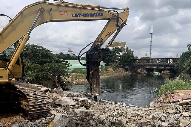 The first target was a concrete bridge built by Bangalore Water Supply and Sewerage Board (BWSSB) on its Sewage Treatment Plant premises behind Marathahalli Police Station in Kadubeesanahalli, which has come up on a storm water drain that connects the Bellandur wetlands.The compound wall of an apartment near Garudacharpalya Lake was cleared. A shed on the rajakaluve behind East Park Ridge and road built on it were also cleared.