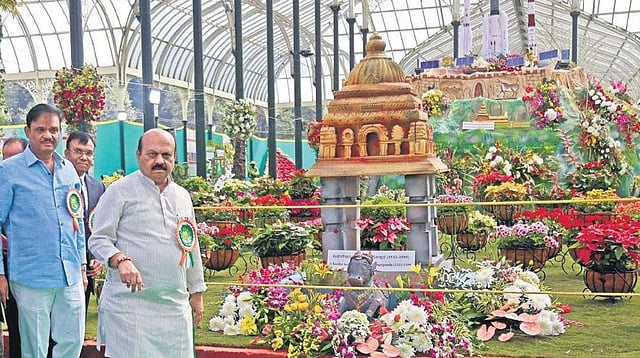 Basavaraj Bommai and Munirathna after inaugurating the R-Day Flower Show, at Lalbagh on Friday. The theme for this year’s show is Bengaluru’s History | Shashidhar Byrappa