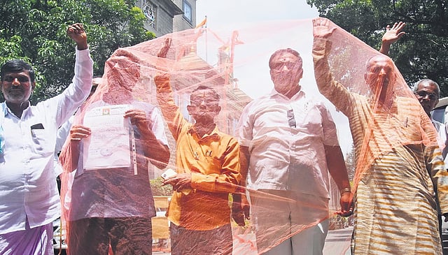 Bengaluru: Draping themselves with a mosquito net, members of the Janata Party held a protest in front of the BBMP head-office accusing the civic body of failing to control the spread of dengue in the city. Speaking to reporters, party secretary Nagesh N demanded an investigation on the huge amount of money spent on mosquito control. ENS
