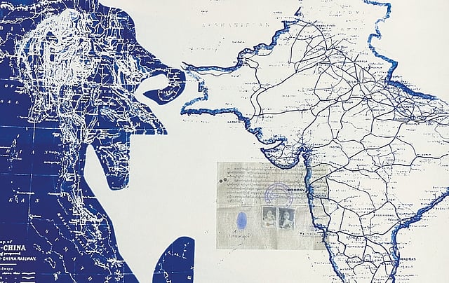 Central to Bhullar’s work is the use of cyanotype, a photographic printing process that produces images in Prussian blue. This technique, historically used for architectural blueprints and geological documentation, becomes a metaphor for the fluid and often precarious lives of refugees. By layering archival maps over digital images of personal objects collected from these refugee homes, Bhullar captures the interplay between memory and materiality. “Both maps and objects defy the inherent notion of permanency because as citizens become refugees due to multiple reasons, their identity as the political selves slips into in-betweenness,” she says.