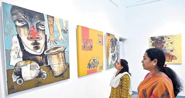 The paintings, made by artists during their workshops conducted by Karnataka Lalithakala Academy, showcase a variety of styles and mediums, from vibrant oil paintings to intricate watercolours.