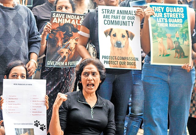 BENGALURU: Hundreds of animal rights activists, rescuers, dog feeders and volunteers staged a protest on Tuesday against the Supreme Court order directing the relocation of stray dogs from hospitals, educational institutions, railway stations, bus stands and other public places.