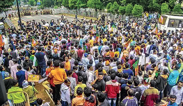 The saffron party activists attempted to make a forced entry by breaking police cordons to gherao Assembly and engaged in a scuffle with police. The police then resorted to lathi-charge to disperse the crowd.