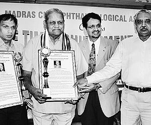 Dr E T Selvam, who is called father of eye camps, was honoured for his role in taking eye camps to the rural areas in the country. He was a retired professor at Regional Institute of Ophthalmology and Government Ophthalmic Hospital (RIOGOH) and had served in government hospitals outside Madras, Thanjavur, Madurai, Tiruchy and Pudukottai.