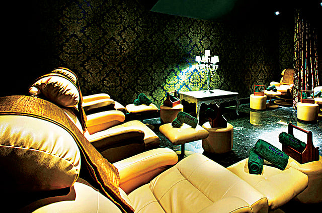 As you enter, do not rush to the ticketing counter to your left, or get hypnotised by the automatic jazz-playing grand piano to your right, instead take a look at the pillar that stands bang in the middle like an elephant’s leg and thank your lucky stars. You are witnessing the largest video pillar in Asia, adorned with 72 LCD screens. Among other firsts, is the concept of a little retail store inside the complex that would sell movie merchandise. Yet another feature is the concept of paid restrooms for women. Spiralling stairs lead to a luxurious setting, complete with tables, chairs, and a personal handwash inside each cubicle that houses an array of moisturisers and other vanity from a London-based company. The fee would be anywhere around Rs 20 to 50.