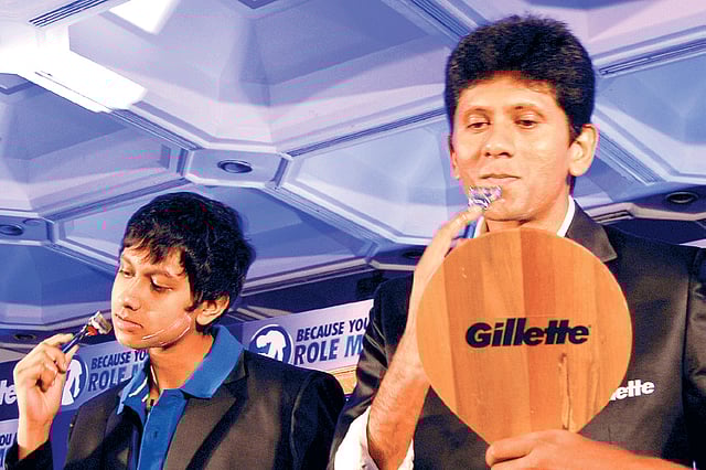 There was also some excitement when the father and son decided to shave together on stage, using Gillette razors, of course. A nervous Prithvi, who had never had a shave before, emulated his father who gave him some pointers here and there.