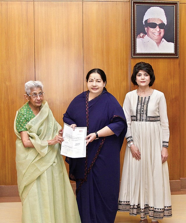 Saroj Goenka and Kavitha Singhania gave a cheque for Rs 1 crore, while Sundaram Finance Ltd chairman S Viji and managing director Srinivasaraghavan offered Rs 3.35 crore. Neyveli Lignite Corporation chairman and managing director S K Acharya donated Rs 2.5 crore.