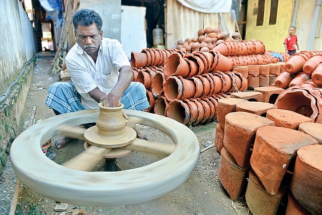 Those mud-filled hands, tired arms and fingers work skillfully in creating the most magnificent products that can be made out of mud, stones and a large wheel. Sitting on a pavement along Kodambakkam High Road with unsold and baked clay pots is S K Govindasamy, a potter who has been churning out pots as a family tradition for the last 36 years.