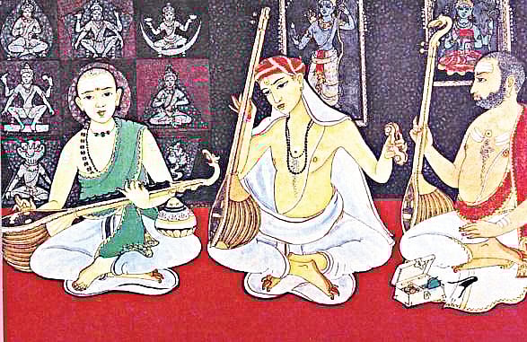 When we turn to the musical trinity of the south — Thyagaraja, Muthuswamy Dikshitar and Syama Sastry — one can see that they did not keep themselves aloof from Hindustani schools of music treating the north and south, as distinct watertight, compartments. Thyagaraja composed his song ‘Samaja vara / gamana’ in the raga ‘Indolam’ according to the swara prasathara then in vogue in the Carnatic school. Sometime later, Dikshitar noticing during his visit to Banaras, a different type of swara manipulation in the handling of ‘malkus’ which is akin to ‘Indolam’. Attracted by deft handling of the new combination of swaras, Dikshitar incorporated it in his ‘Neera jakshi Kamakshi’, a kriti in ‘Indolam’ composed by him. This was emulated by Thagaraja in his kriti ‘Manasulonima’.