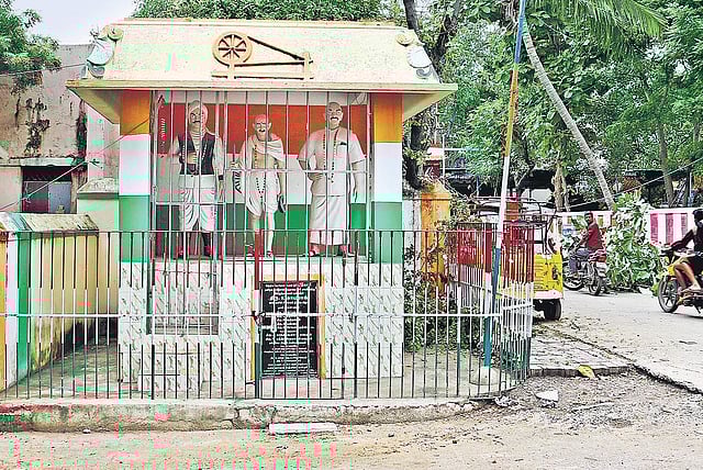 The shrine, which is flanked by two fluttering tricolour flags, has a washing of orange, white and green paint on the outside and inside, where the three statues stand tall and proud. The visages of Gandhi, Bharatiyar and Kamaraj gaze over the street and its residents, unblinking.