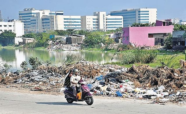 CHENNAI: Apart of the Kallu Kuttai Lake which lies less than a kilometre away from Taramani MRTS station, shrouded from the public eye, has turned into a dumping ground, especially for construction debris. The periphery of the lake is strewn with garbage and heaps of construction waste along with a heavy infestation of weeds which have grown up to five feet in height.