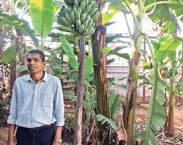 Today, his garden boasts of a variety of plants and trees.“We have jasmines, samantis, sunflowers, a variety of roses, palm trees and other decorative plants.” But as of late, he has taken a keen interest in growing fruit bearing trees. “One of the reasons for the reduction in the number of flowers is also because of the shade of the growing trees and banana plantains around,” he says. From mango, jackfruit, coconut, chikkoo, pomegranate and jamun trees, he has also grown shade — poppy trees and silver oaks. “Among plantains, we mainly have the Elakki, Karpooravalli and the Robusta varieties,” he adds.