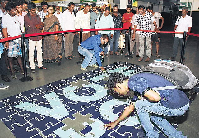 CHENNAI : As the crowd gathers outside the Higginbothams stall in Central station, those in the seating area peer over the people standing to see a jigsaw puzzle on the floor. A person picks up a piece and scrutinises the puzzle before placing it down. The puzzle reads, ‘Vote Podu’.Dunzo, The Internet Generation and Puratchi Thalaivar MG Ramachandran Central Station organised a voter awareness event on Tuesday. Social media influencers and locals put together a jigsaw puzzle, which will remain at the station premises till April 18.