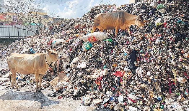 Express spotted around ten to fifteen cows inside the dumpyard itself, climbing on top of the mountain, nibbling garbage including plastic and aluminium. This utter civic negligence comes in the wake of TANUVAS doctors removing 52 kgs of garbage from a cow's stomach.