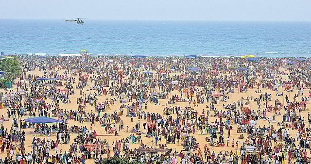 The city police employed five drones and when it flew low people were seen waving and waiting for their turn of the live telecast. The self balancing vehicles with sirens also caught the eye and many were seen clicking selfies.To make sure no children got separated from the parents, police gave identity tags that had names and mobile phone numbers of the parents. The officials at 11 help centres on the beach were constantly on their toes. According to the police, around 35 persons went missing and were found by the help centres. Personnel were deployed to announce names of missing people and create awareness about not littering.