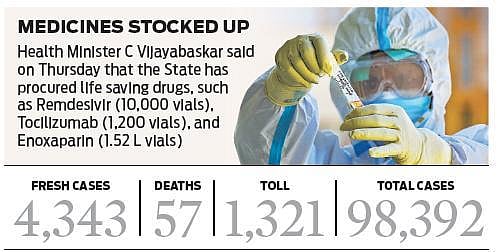 Breaking yet another record, Tamil Nadu on Thursday registered 4,343 new cases and 57 deaths, of which 2,027 cases were in Chennai. As the State continues its march towards 1 lakh total cases, two more AIADMK legislators -- N Sathan Prabhakar (Paramakudi) and R Kumaraguru (Ulundurpet) -- tested positive on Thursday.